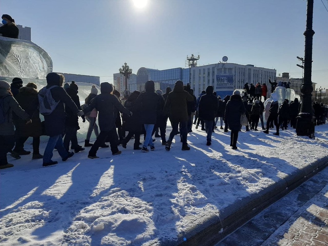 Акция в Хабаровске, в отличие от большинства городов страны, началась не в 14.00, а в 12.00 по местному времени. Около тысячи человек собрались у ледового городка, скандируя: «Свободу Навальному!» и «Мы здесь власть!». На лозунги незамедлительно отреагировали сотрудники Росгвардии, начавшие точечные, но довольно жесткие задержания протестующих. На глазах корреспондента «Новой» схватили пятерых человек. Хабаровчане ответили на винтилово скандированием «Фашисты!».
