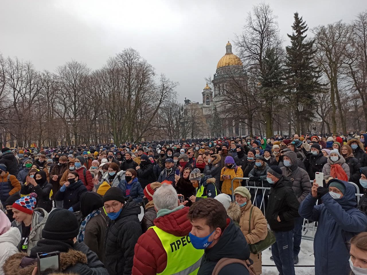 В Петербурге 23 января на акции в поддержку Алексея Навального, по оценке корреспондента «Бумаги», к 14:30 собралось около 2 тысяч человек. На Сенатскую площадь продолжают приходить люди.
