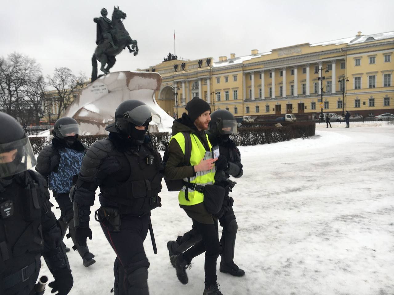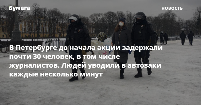 В Петербурге до начала акции за освобождение Алексея Навального массово задерживают людей. Полицейские каждые несколько минут уводят в автозаки людей на Сенатской площади, на момент публикации новости задержаны минимум 28 человек, сообщает корреспондент «Бумаги».