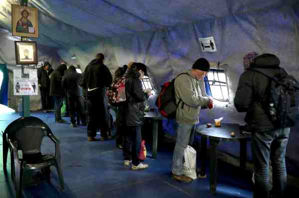 В «Ангаре спасения» людно: на улице ветер и холод, а тут кормят и обогревают. Рассказать о себе готовы несколько человек — остальные отвечают «хочу все забыть, а не вспоминать». Многие говорят тихо и невнятно и как будто беседуют сами с собой: мужчина в шапке-ушанке рассуждает о биороботах, пенсионер в ковбойской шляпе по имени Хажак утверждает, что у него два высших образования, МГУ и МАИ, а сам он работал инженером-конструктором и преподавателем физики в Шатуре и оставил квартиру загулявшей жене. Оказывается, ту же самую историю о себе он рассказывал «Комсомольской правде» в 2011 году. Прошло десять лет, и, похоже, что в жизни Хажака ничего не поменялось, хотя он уверяет, что послезавтра едет к дочке в Оренбург.