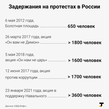 Акция в поддержку Навального 23 января побила рекорд по задержаниям. Сравнение с другими митингами