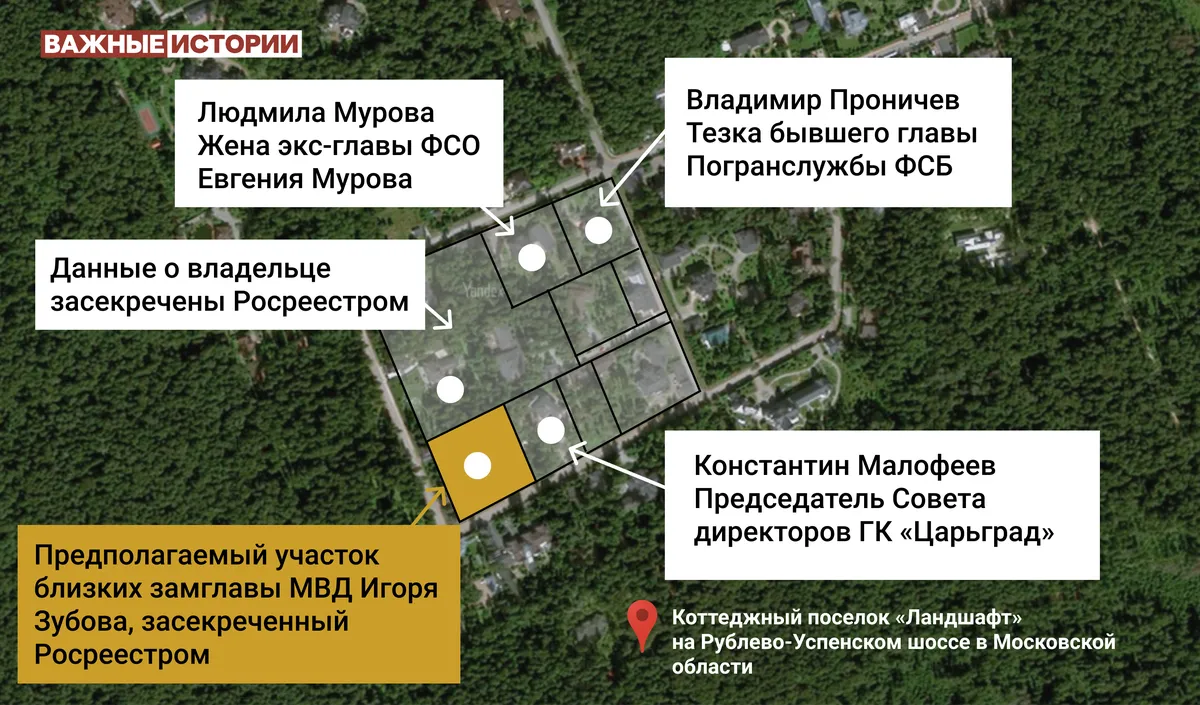 Только кадастровая стоимость участка и домов в Жуковке превышает 120 миллионов рублей — рыночная, скорее всего, в несколько раз больше. Узнать, кого Росреестр спрятал под именем «Российская Федерация», невозможно. Но, как выяснили «Важные истории», Игоря Зубова так скрывали не раз. С 2000-го по 2005-й и с 2007 по 2012 год он был собственником участка в поселке Лунево на территории дачного хозяйства МВД, согласно архивным данным ЕГРН. А в актуальной выписке из Росреестра в оба этих периода владельцем значится «Российская Федерация».