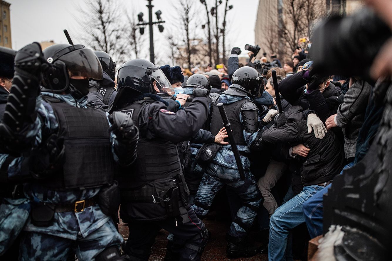 Митинг в Москве начался на Пушкинской площади, продолжился жесткими разгонами с участием ОМОНа у станции «Цветной бульвар» и закончился задержаниями и избиениями у СИЗО «Матросская тишина», где сидит Навальный (ворота изолятора перекрыли грузовиком). Протестующие кидали в силовиков снежки. Забросали в том числе машину ФСБ с мигалкой: разбили стекло и повредили водителю глаз.
