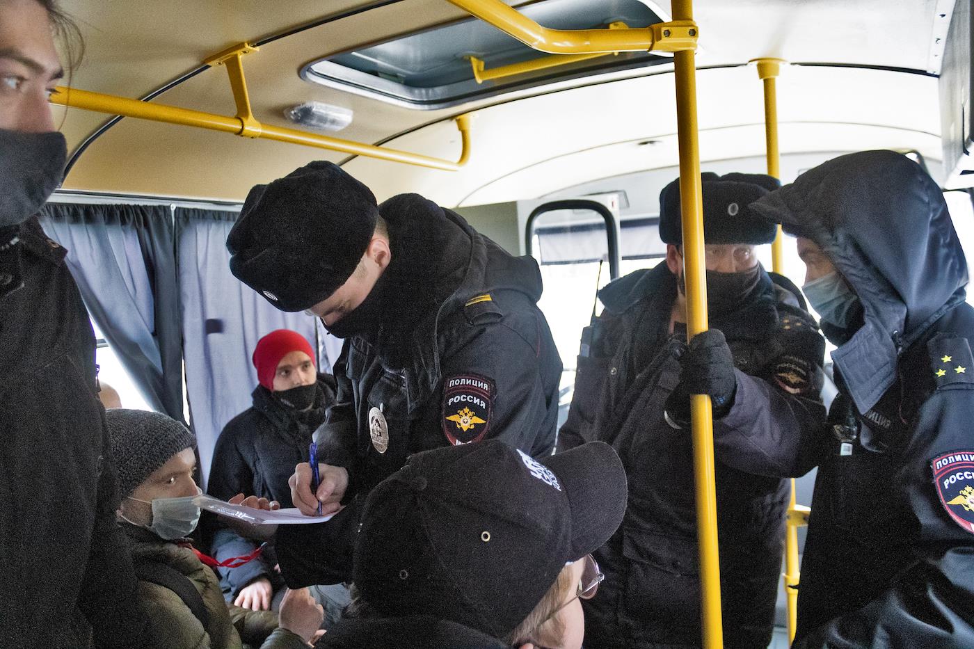 Задержанные в одном из автобусов полиции во время акции в поддержку Алексея Навального в Казани 23 января 2021 года. Фото: Данила Егоров / Коммерсант