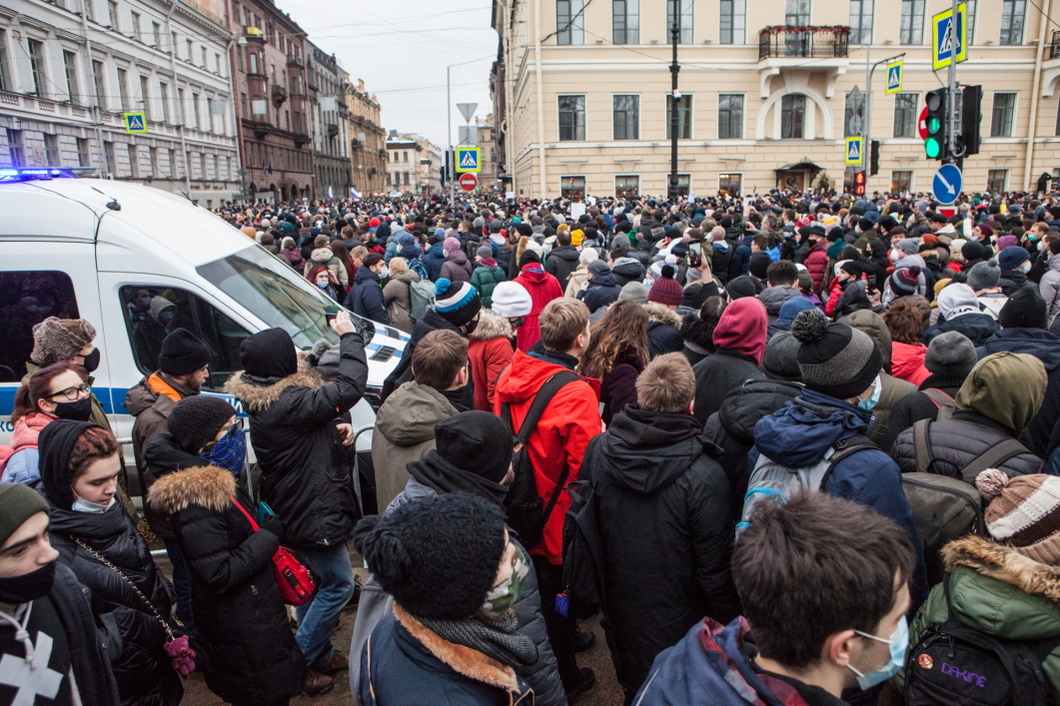 В субботу в поддержку Алексея Навального несколько тысяч человек прошли по Невскому проспекту от Сенатской площади. Практически не встретив сопротивления. Реальное число участников оценить крайне сложно — в один момент протест распространился по всему центру города. При этом участники митинга также столкнулись с жестокостью со стороны силовиков: во время акции сотрудник ОМОНа сильно ударил Маргариту Юдину в живот ногой. В итоге ее пришлось госпитализировать.