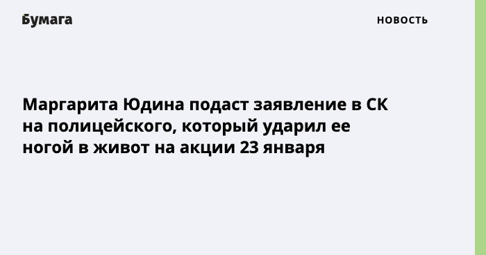 Маргарита Юдина, которую на акции 23 января в Петербурге сотрудник полиции ударил ногой в живот, подаст заявление в Следственный комитет. Об этом сообщает объединение «Команда 29», которое будет представлять ее интересы.