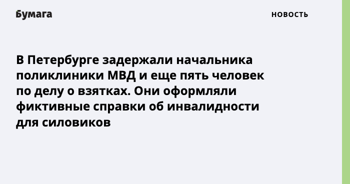 В Петербурге задержали начальника ведомственной поликлиники МВД, двух его заместителей и еще трех человек по уголовному делу о получении взяток. Об этом сообщает ТАСС со ссылкой на ГУ МВД по городу и Ленобласти.