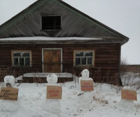 Снеговики на опубликованных Калининой фотографиях держат перед собой плакаты «Долой царя», «Вова между нами все кончено», «Это наша страна» и «Мир художникам войну дворцам». Издание «Двина сегодня» сообщает, что полицейские уничтожили и снеговиков, и плакаты.