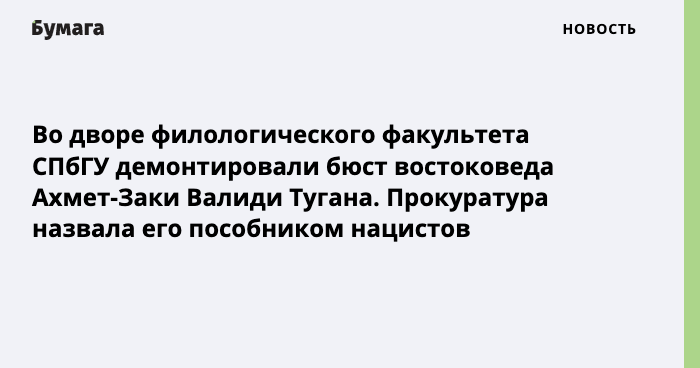 В Петербурге во дворе филологического факультета СПбГУ по требованию прокуратуры демонтировали бюст востоковеда Ахмет-Заки Валиди Тугана. Об этом сообщает «Фонтанка».