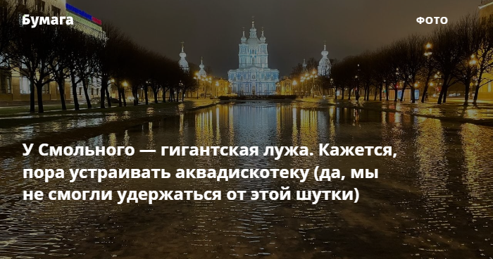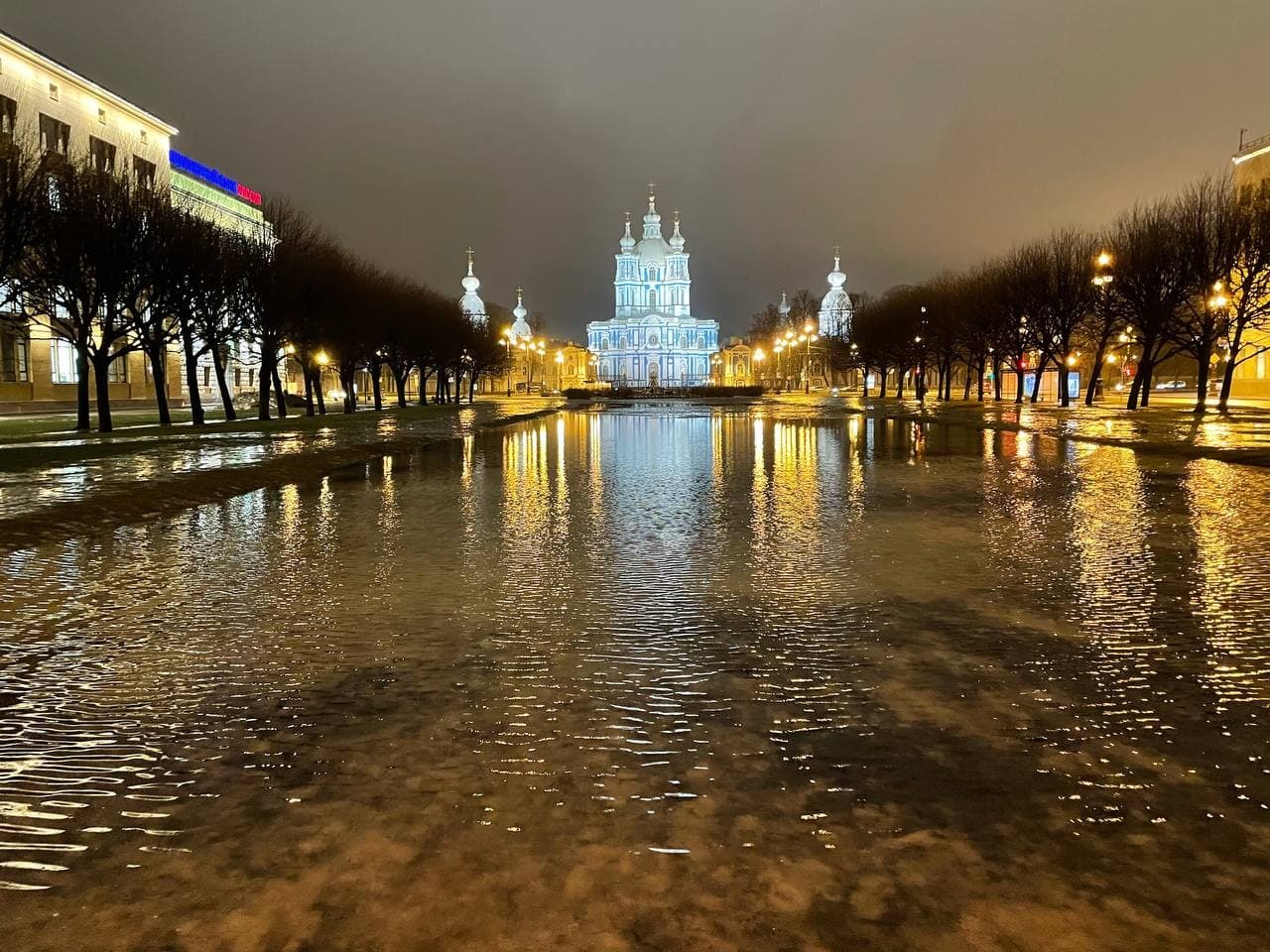 Из-за плюсовой температуры у Смольного собора в Петербурге образовалась гигантская лужа. Вечером 26 января ее сфотографировала шеф-редактор «Бумаги» Александра Шаргородская.