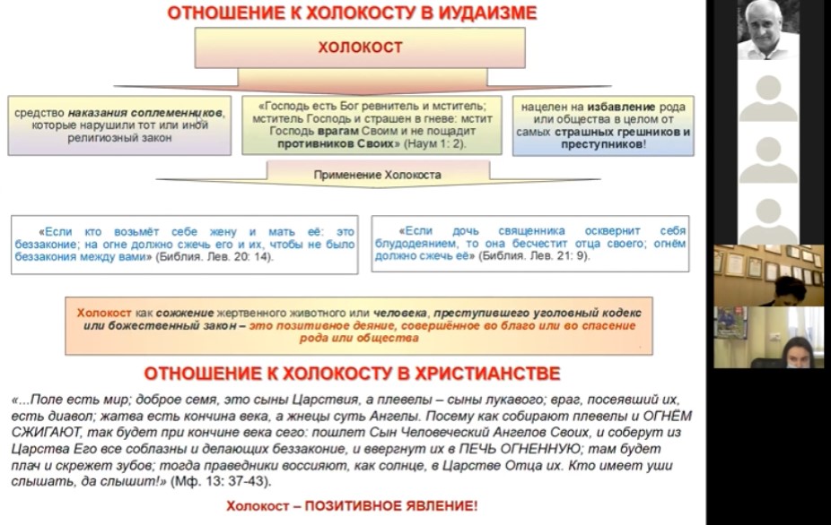 Другое дело – я не понимаю, зачем его презентацию дали досмотреть и дослушать до конца. Организаторы должны были сказать, что они не могут такого допустить. Надо было его прервать, и все. Там достаточно было начала – он ведь начал с того, что человеческие жертвоприношения были в еврейской традиции. Еще один знаток Талмуда и Торы! Это же кровавый навет, сто лет назад в России это уже было – дело Бейлиса. Но в данном случае Матвеев не стал говорить, что евреи пьют кровь христианских младенцев, в его трактовке они приносили другие человеческие жертвы – вероятно, среди своих. Ведь Холокост – это жертвоприношение, но Матвеев даже не понял, что это греческое слово, а древние евреи его не знали, они предпочитали не по-гречески общаться. Там же есть еще одна фраза, что с точки зрения христианства Холокост – это позитивное явление, а дальше бред только усугубляется. Даже Гитлер ворочается в гробу, потому что Матвеев поставил под сомнение его расовую чистоту, назвал полукровкой. Я говорю с иронией, но на самом деле я возмущен: не часто у нас выступают такие пещерные антисемиты, их можно найти на помоечных сайтах, а в научное сообщество их обычно не пускают. Мы всегда привыкли говорить, что они маргиналы, а тут оказывается, что это человек с регалиями, преподаватель вузов, находящихся на государственном финансировании. Он пересказывает всем известные работы отрицателей Холокоста, ничего нового он не придумал. Имеет смысл спросить, как человек с такими взглядами и с такой моралью может вообще что-то преподавать.
