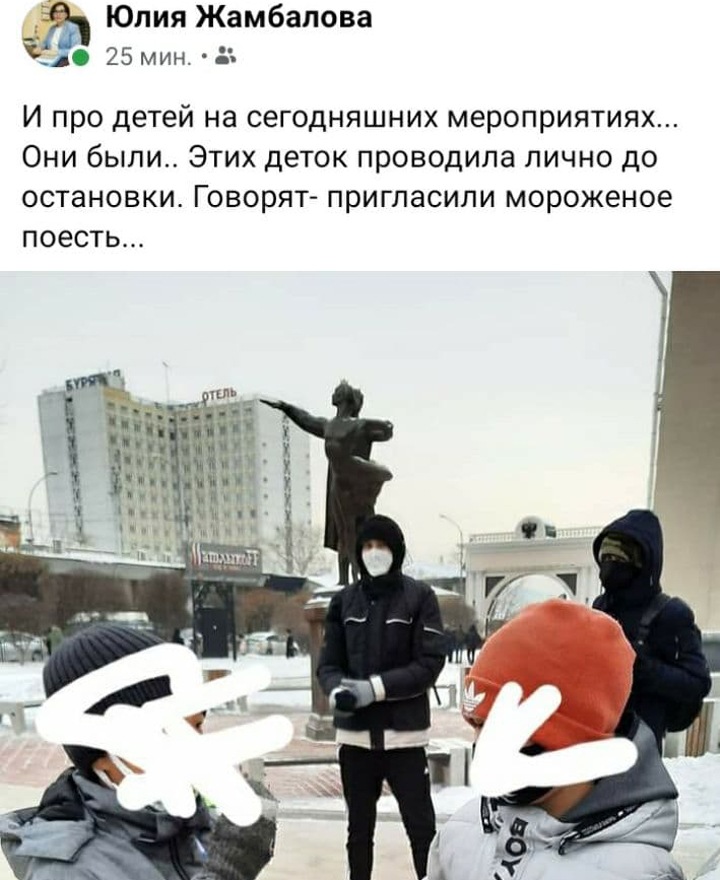 «И про детей на сегодняшних мероприятиях… Они были. Этих деток проводила лично до остановки. Говорят — пригласили мороженое поесть…», — написала 23 января в фейсбуке омбудсмен Жамбалова (пунктуация сохранена).