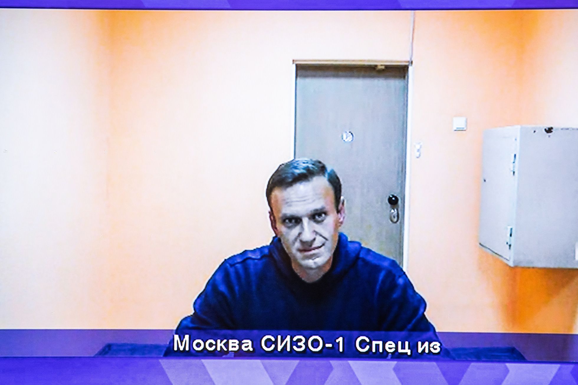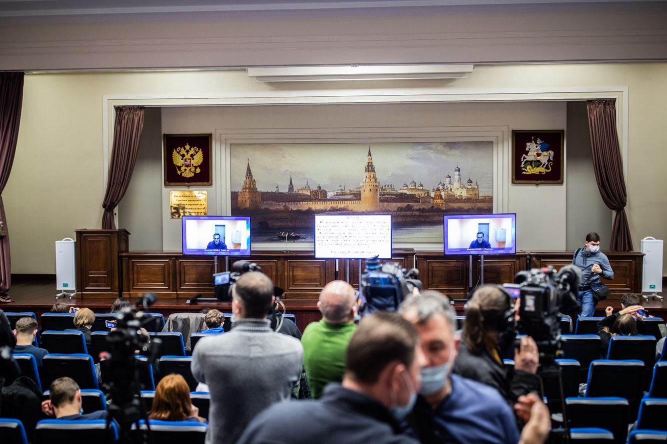 Журналисты собрались в актовом зале суда. Стены зала украшены пейзажем: Москва-река, Московский окружной суд, Московская судебная палата и Кремль. На два экрана выведено изображение комнаты с голыми стенами, внизу надпись — «Москва СИЗО-1. Спец из». Около двух часов дня в это помещение в сопровождении двух сотрудников ФСИН заходит Алексей Навальный.