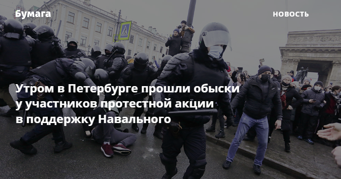 Утром 28 января в Петербурге прошли обыски у нескольких участников протестной акции в поддержку арестованного Алексея Навального. Об этом сообщает «ОВД-Инфо» со ссылкой на активистов.