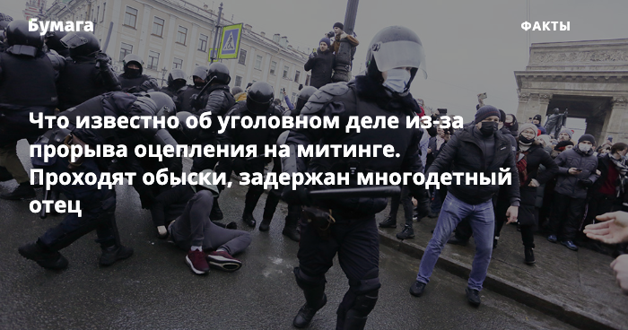 Следственный комитет возбудил уголовное дело о применении насилия к представителю власти после митинга 23 января. По версии следствия, несколько силовиков пострадали в результате «прорыва оцепления» у «Дома книги» на Невском проспекте.
