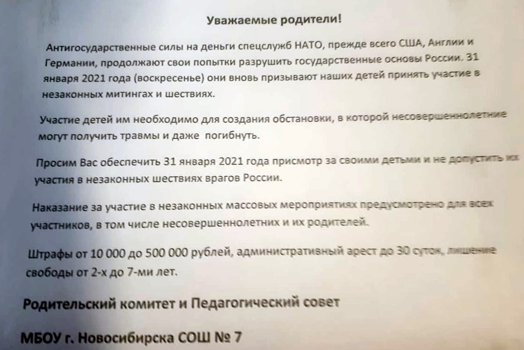 «Антигосударственные силы на деньги спецслужб НАТО, прежде всего США, Англии и Германии, продолжают свои попытки разрушить государственные основы России, — сказано в распечатанном на принтере и сфотографированном для рассылки обращении. — 31 января 2021 года (воскресенье) они вновь призывают наших детей принять участие в незаконных митингах и шествиях. Участие детей им необходимо для создания обстановки, в которой несовершеннолетние могут получить травмы и даже погибнуть».