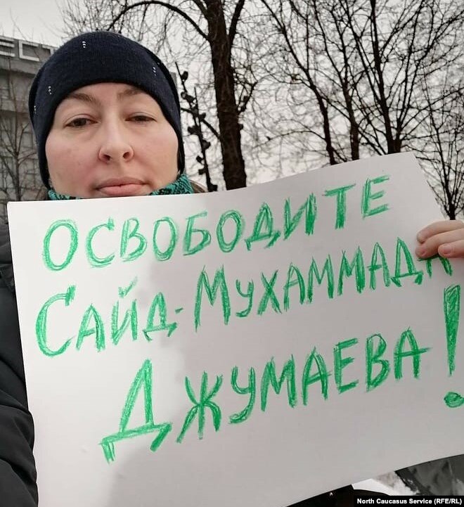 На плакатах, с которыми активистка вышла 29 января, было написано "освободить Джумаева", "свободу политзаключенным" и "свободу всем невиновным".