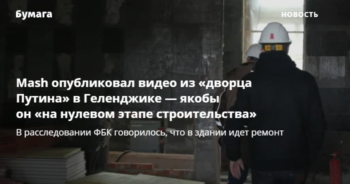 Телеграм-канал Mash опубликовал видео из якобы пустого «дворца Путина» в Геленджике, про который ранее в своем расследовании рассказывал Алексей Навальный. По словам главного редактора Максима Иксанова, попасть внутрь им помог представитель технического надзора, следящий за возведением здания шесть лет (его имя не называется).