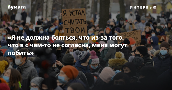 Есть несколько факторов, [из-за которых я вышла]. Первый фактор: меня шокировали аппетиты нашего президента и его приближенных. Я, видимо, до фильма Навального не осознавала масштабы коррупции. И второе: вне зависимости от моего отношения к Навальному лично, я считаю, что людей не должны судить по несуществующей статье в выдуманном суде. И есть третий фактор: когда я обдумывала, идти ли мне на «гуляние» 23 января, я поняла, что боюсь, а боюсь я того, что меня побьют. И я считаю, что это неправильно: я не должна бояться, что из-за того, что я с чем-то не согласна, меня могут побить. Поэтому я здесь.