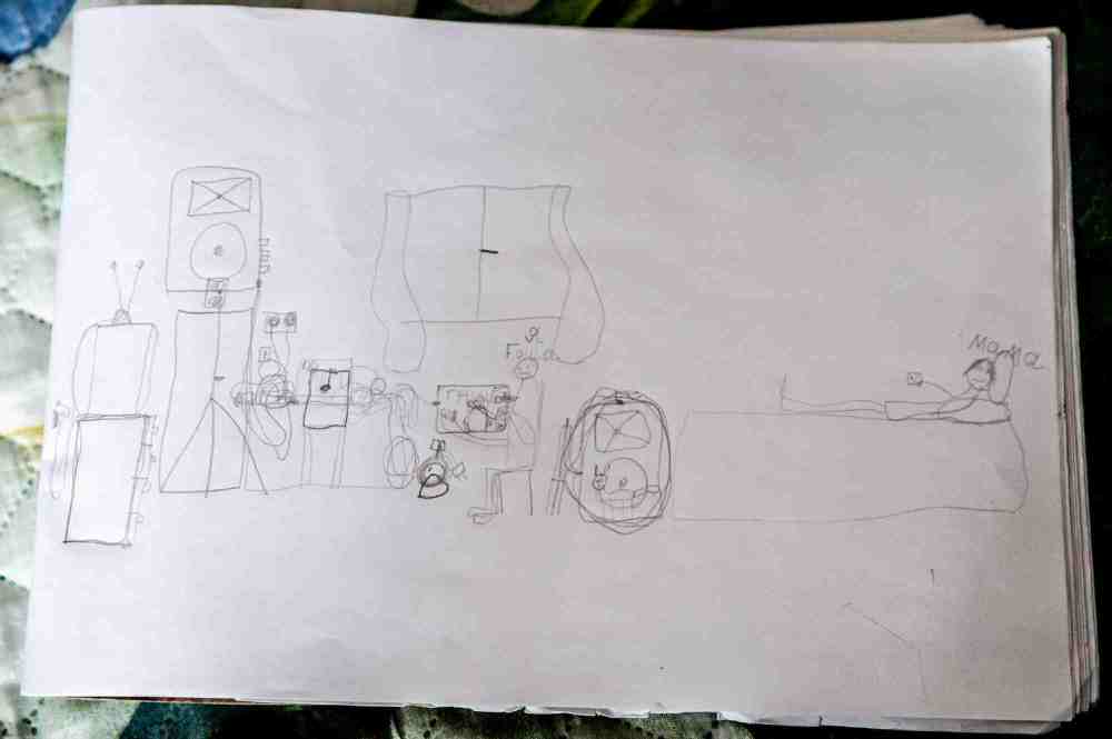 Гоша долгое время рисовал маму на листочках: выводил черной краской ее силуэт на кровати, рядом — стул, на котором висели его вещи, и себя в уголке.