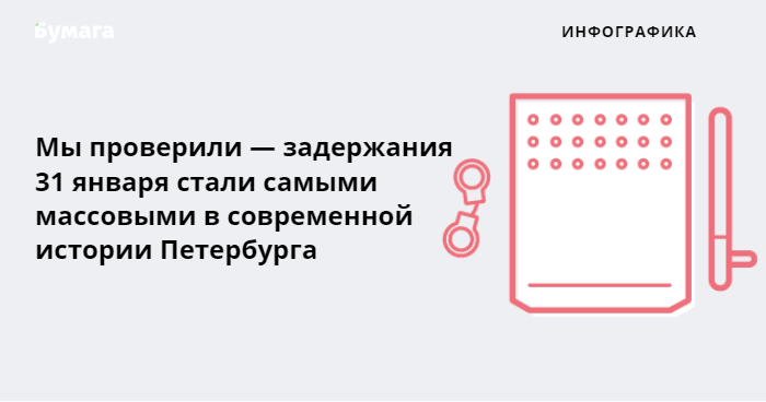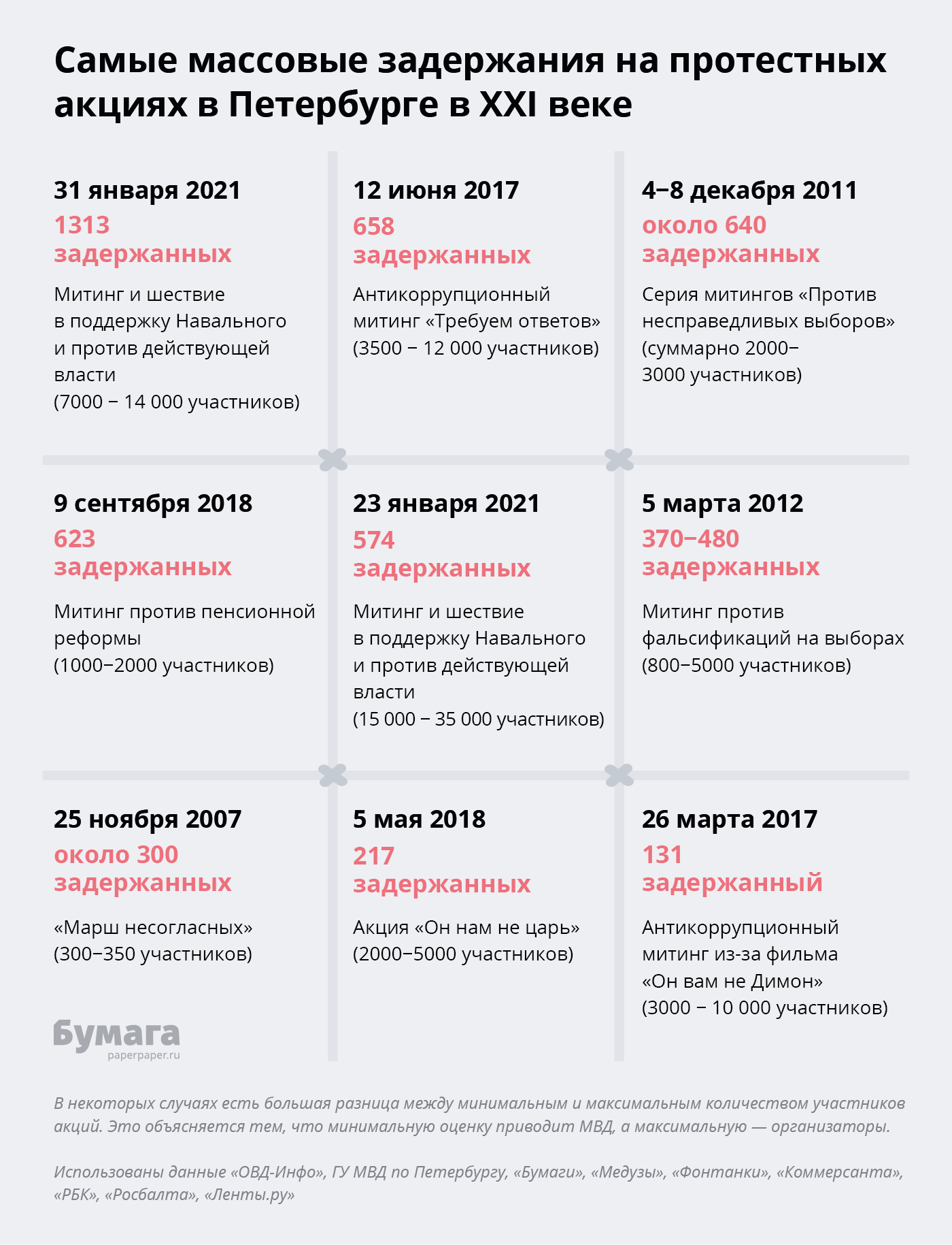 На протестной акции в Петербурге 31 января, по последним данным «ОВД-Инфо», задержали более 1300 человек. Это в два раза больше, чем на антикоррупционном митинге летом 2017-го, когда был установлен предыдущий антирекорд. «Бумага» сравнила число задержаний на всех крупных протестных акциях с 2000 года — и убедилась, что ничего подобного в современной истории Петербурга еще не было. Смотрите график с самыми массовыми задержаниями в городе в XXI веке.
