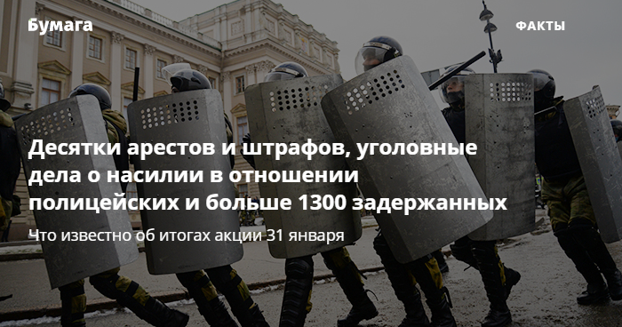 К 1 февраля в России возбудили уже 40 уголовных дел в связи с протестами 31 января. В Петербурге известно о трех делах по статьям о применении силы к полицейским.