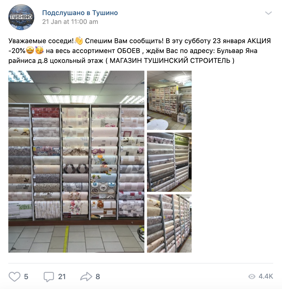 Пост все еще доступен — это сообщение об акции и скидке на обои в магазине «Тушинский строитель». Комментарий Оленева уже удален.