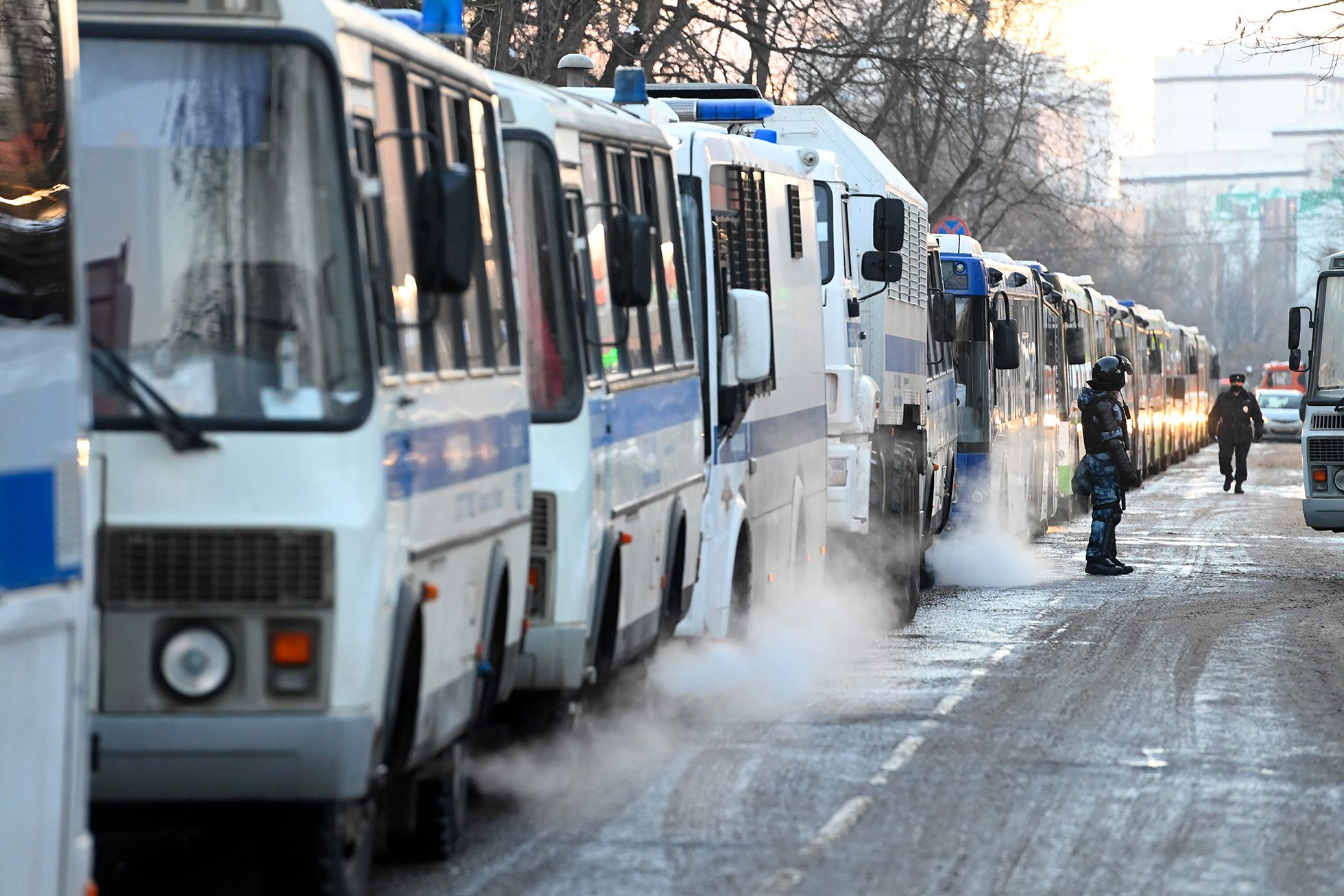 Автобусы, которые привезли полицейских к Мосгорсуду. Фотография дает представление о том, сколько же сотрудников полиции охраняют подходы к зданию.