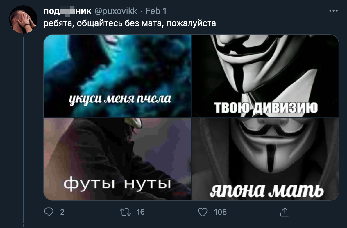 1 февраля наступила новая реальность — ВК, твиттер, телеграм и инстаграм очистились от мата! Ведь власти обязали соцсети удалять посты, содержащие нецензурную брань. Теперь в твитах нежелательно цитировать актрису Элизабет Олсен и первый раунд баттла Оксимирона против Джонибоя с «той самой цитатой». Нужно писать вот так:
