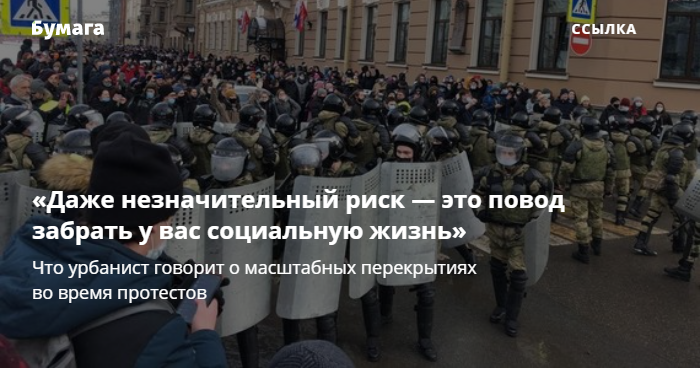 Урбанист Алексей Радченко опубликовал пост в телеграме о масштабных перекрытиях во время очередной акции в поддержку Навального и против действующей власти. В Москве и Петербурге 31 января ограничивали проход по улицам, а также закрывали станции метро. На Невский проспект пускали по паспортам, люди жаловались, что из-за этого не могли попасть на работу.