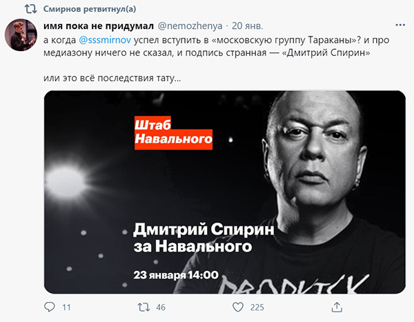 Журналиста преследуют за то, что он ретвитнул чужую шутку о сходстве внешности Смирнова и вокалиста панк-рок-группы "Тараканы" Дмитрия Спирина, сообщает "Медизона". Публикация сопровождалась картинкой с фотографией Смирнова и датой и временем акции в поддержку Алексея Навального 23 января. Тем самым, говорилось в административном протоколе, журналист "совершил организацию публичного мероприятия".