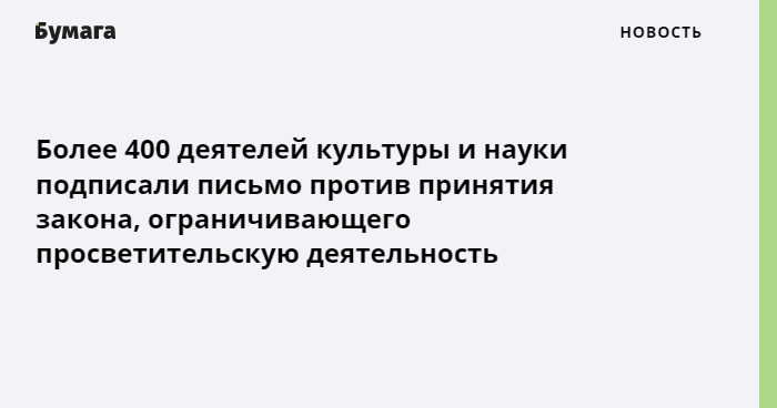 Более 400 деятелей культуры, образования и науки подписали открытое письмо с требованием не принимать законопроект, ограничивающий просветительскую деятельность в России.