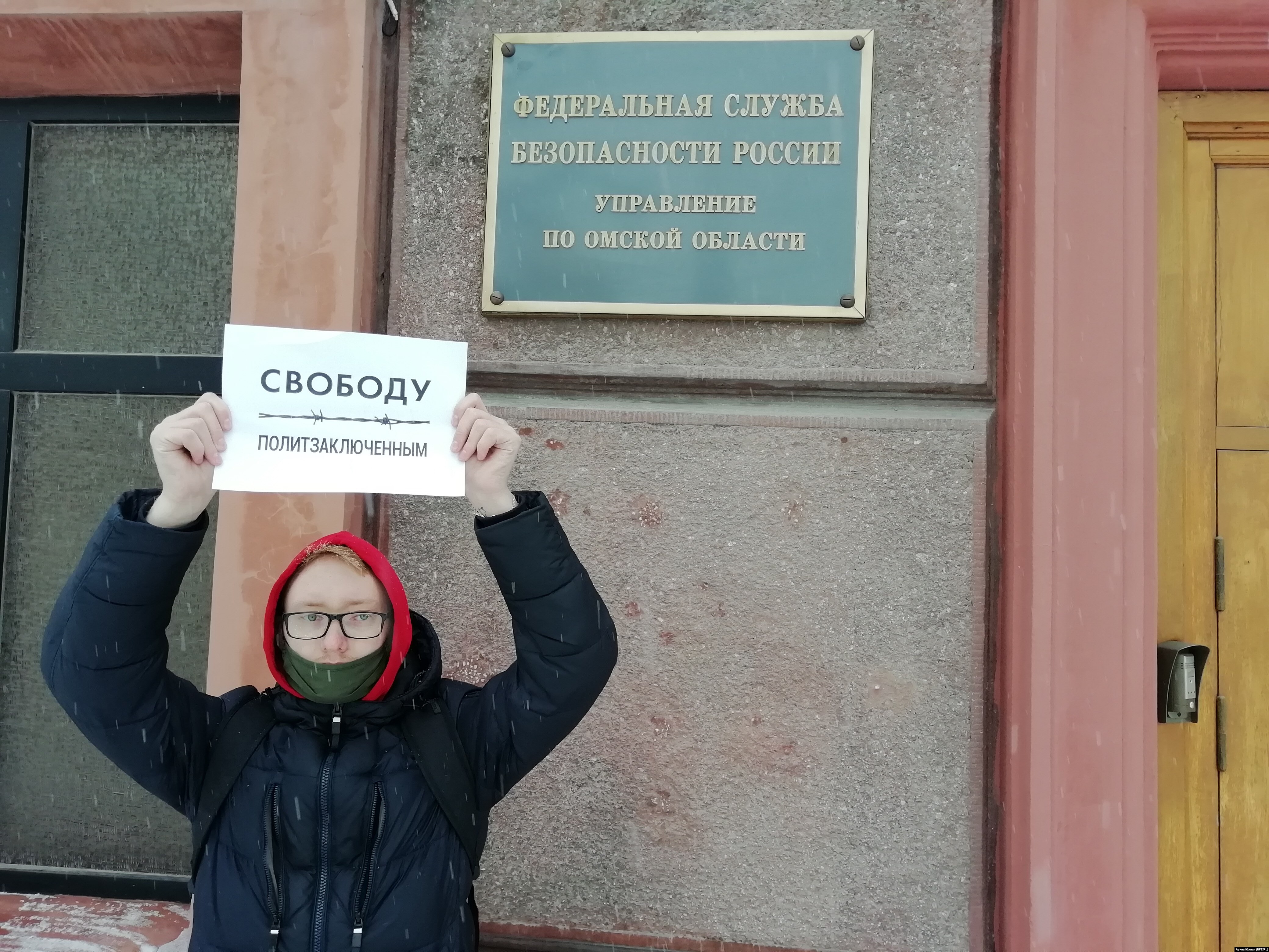В Омске активист партии "Яблоко" Никита Рудовол провел одиночный пикет у дверей регионального ФСБ. На его плакате было требование - освободить политзаключенных, передает корреспондент Сибирь.Реалии.