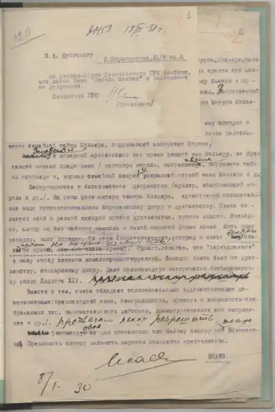 В роли волшебной помощницы во втором сюжете выступила Елена Сергеевна Булгакова. В конце 1950-х годов она приняла решение передать архив государству, разделив наследие Булгакова на две неравные части: архив Булгакова-романиста (а также эпистолярное наследие) и архив Булгакова-драматурга. Обладателем первой стала Российская государственная библиотека имени Ленина, вторую получил Пушкинский Дом. Уместен ли вопрос, какая часть ценнее? В Пушкинском Доме хранятся рукописи пьес «Дни Турбиных» (первое название — «Белая гвардия»), «Бег», «Мольер», «Александр Пушкин» («Последние дни»), «Дон Кихот», инсценировок и либретто «Мертвые души», «Война и мир» — от черновых набросков в тетрадях до завизированных Реперткомом текстов. Собрание пьес дополнили материалы, связанные с их постановкой, а также переписка драматурга с соавтором и режиссерами: В. В. Вересаевым, К. С. Станиславским, В. И. Немировичем-Данченко, В. Э. Мейерхольдом, И. А. Пырьевым. В РГАЛИ — зеркальное отражение театрального фонда, «официальная» история булгаковских пьес: рукописи с правкой из фондов Главреперткома, Союза писателей, Комитета по делам искусств, издательств, театров и журналов — бесконечная тяжба Булгакова с государством, череда запрещений, мучительных согласований, вынужденных поправок и отказов исправлять. В 2020 году практически все театральные материалы были опубликованы на нашем портале [3].
