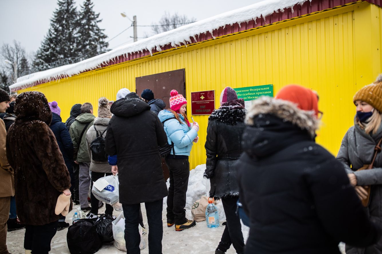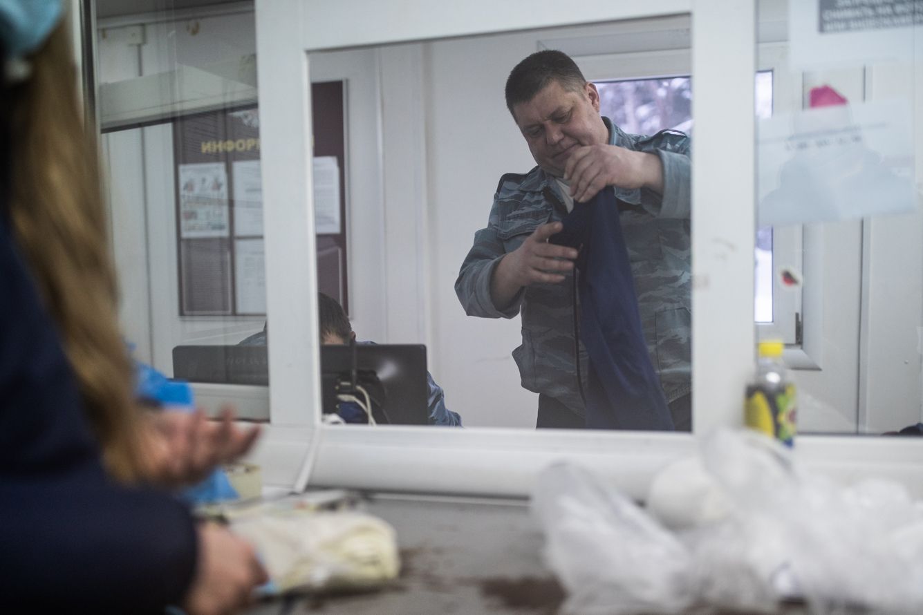 У входа в помещение для приема передач очередь координирует мужчина со списком ожидающих — их больше 150 человек. Сначала вещи и продукты принимали только два сотрудника центра. После звонков на все возможные горячие линии к собравшимся «вышел полковник и распорядился добавить людей», рассказывает Марина. Теперь их трое: один переписывает паспортные данные родственников, другой описывает содержимое пакетов, третий проводит тщательный досмотр вещей, открывая каждую бутылку с водой. В созданном волонтерами телеграм-чате люди выясняют номера камер, где сидят их близкие, чтобы передать все необходимое на всех за один раз.