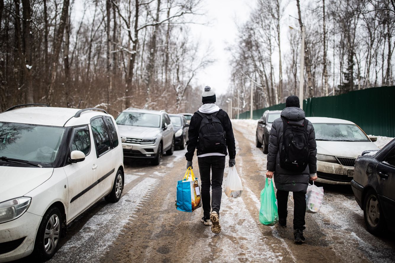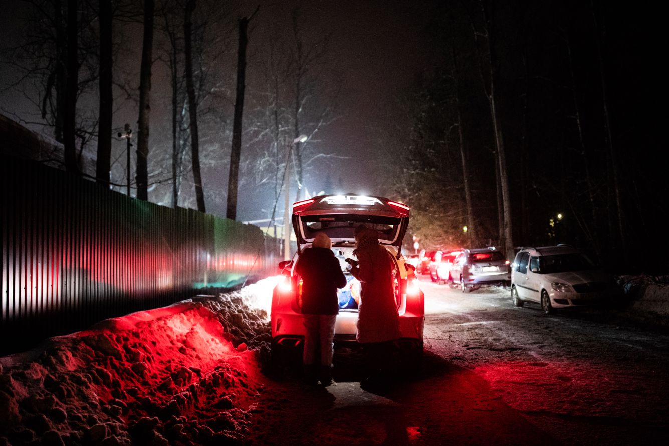 Слева — небольшая парковка, на которой не хватает места для всех, кто приехал узнать о судьбе своих близких или передать им вещи и продукты. Они паркуют машины вдоль дороги на подъезде к центру. Передачи сотрудники центра принимают в бытовке, люди с сумками заходят туда по одному. Рядом с ней три десятка человек: матери, братья, сестры, друзья задержанных и волонтеры. «Здесь можно погреться» — написано маркером на листе, прикрепленном к заднему стеклу одного из автомобилей. Водители других машин тоже пускают к себе мерзнущих людей. Кто-то привез для всех пиццу, кто-то — горячий кофе.
