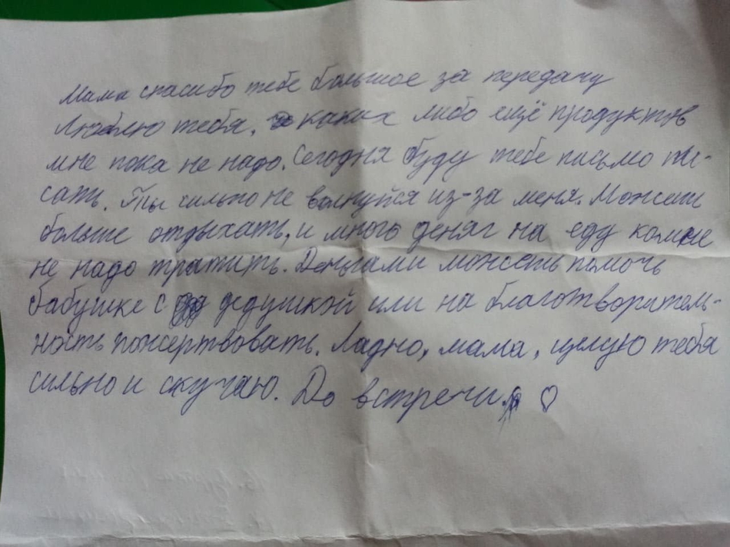 «Мама спасибо тебе большое за передачу Люблю тебя. Каких либо ещё продуктов мне пока не надо. Сегодня буду тебе письмо писать. Ты сильно не волнуйся из-за меня. Можешь больше отдыхать, и много деняг на еду комне не надо тратить. Деньгами можешь помочь бабушке с дедушкой или на благотворительность пожертвовать. Ладно, мама, целую тебя сильно и скучаю. До встречи».