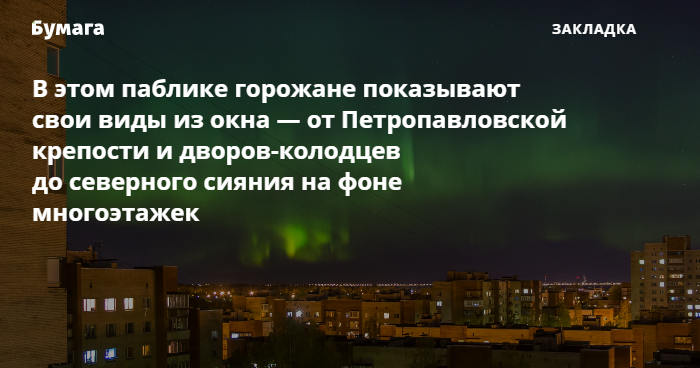 В паблике «Вид из моего окна | Петербург» горожане делятся снимками, которые делают из окон своих домов. Люди показывают Петропавловскую крепость, парки, закаты и северное сияние на фоне многоэтажек.
