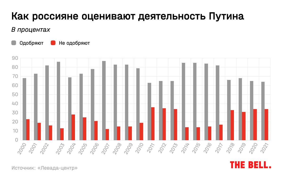 В целом по всем возрастам уровень одобрения и неодобрения деятельности президента за последние четыре года принципиально не изменился. По данным за январь 2021 года, его деятельность одобряют 64% россиян. Не одобряют — 34%. Такими же эти показатели были до присоединения Крыма.