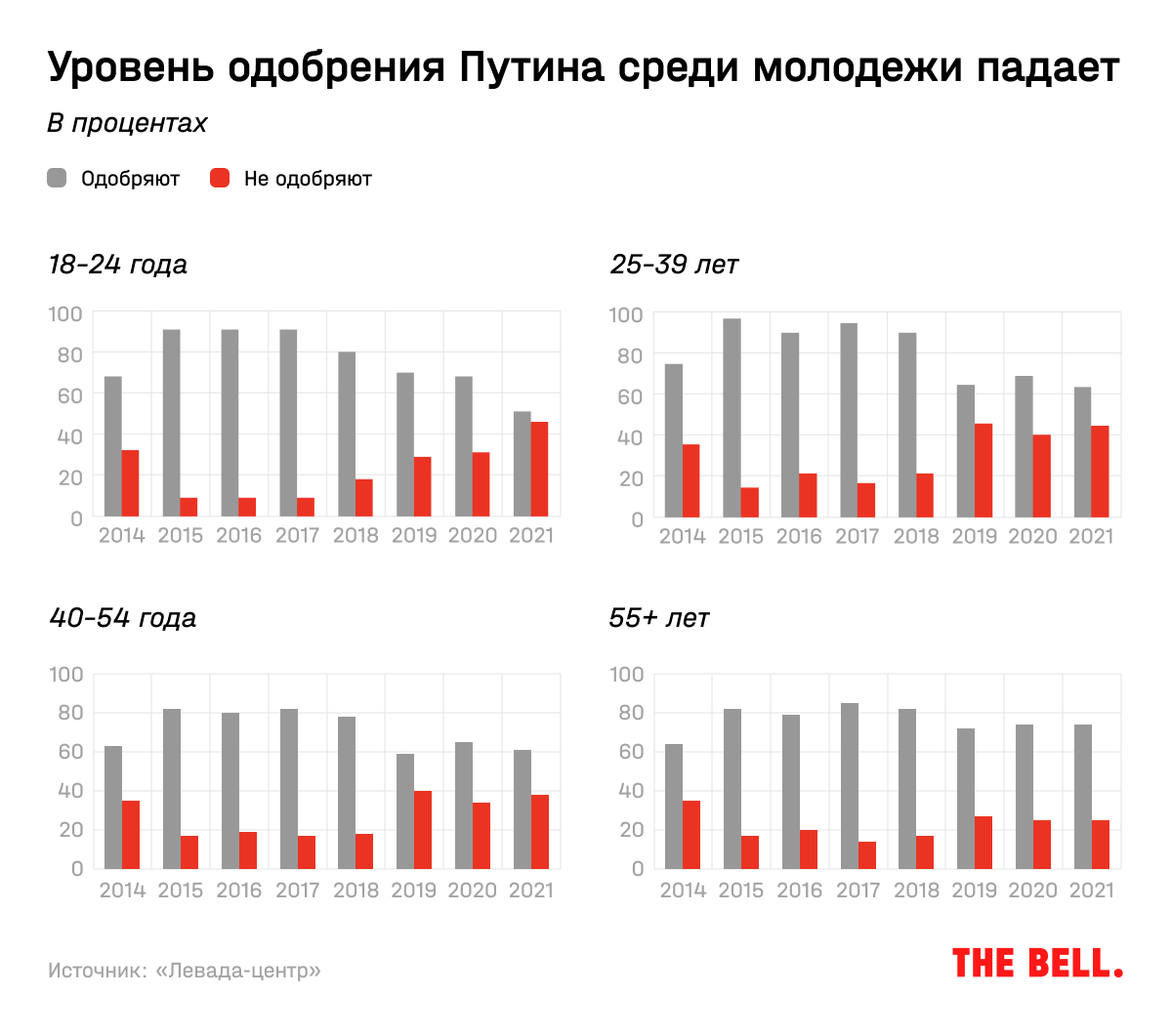 Только половина людей в возрасте 18–21 одобряет деятельность Путина, показал опрос «Левада-центра», проведенный в январе 2021 года (результаты есть у The Bell). С января 2020 года уровень одобрения президента в этой группе упал на четверть, а по сравнению с посткрымской эйфорией — почти наполовину. Расхождение во взглядах со старшим поколением 55+ растет с каждым годом.