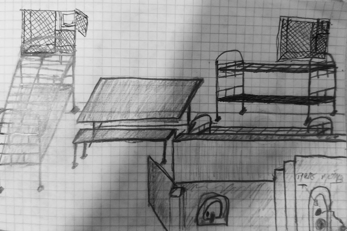 «Туалет — тоже отдельная песня, — продолжает Емельянов. — Дырка в полу, то есть напольный унитаз. Благо хотя бы были перегородки. Но зато не работал слив. Приходилось набирать воду в тазик — и уже потом смывать».