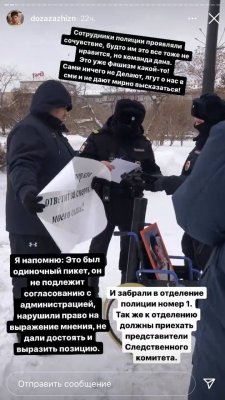 Как пишет жена пикетчика Светлана Рукосуева, он смог только несколько минут простоять в одиночном пикете, как к нему подошли полицейские и попросили пройти с ними. Рукосуева доставили в отдел полиции № 1 Красноярска, где на него составили протокол.