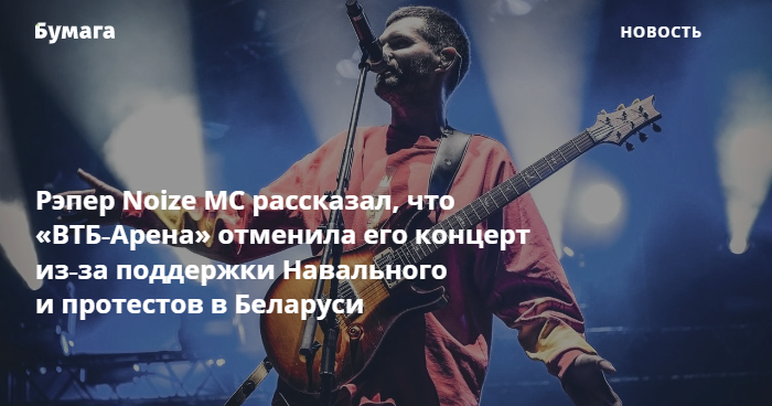 Рэпер Noize MC (Иван Алексеев) рассказал, что представители московской «ВТБ-Арены» отказали ему в проведении концерта из-за выступлений в поддержку политика Алексея Навального и оппозиции в Беларуси. Об этом пишет The Flow.