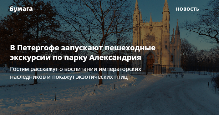 С 13 февраля музей-заповедник «Петергоф» запускает пешеходные экскурсии по парку Александрия, в XIX веке служившему частной загородной резиденцией Романовых. Об этом «Бумаге» рассказали в пресс-службе музея.