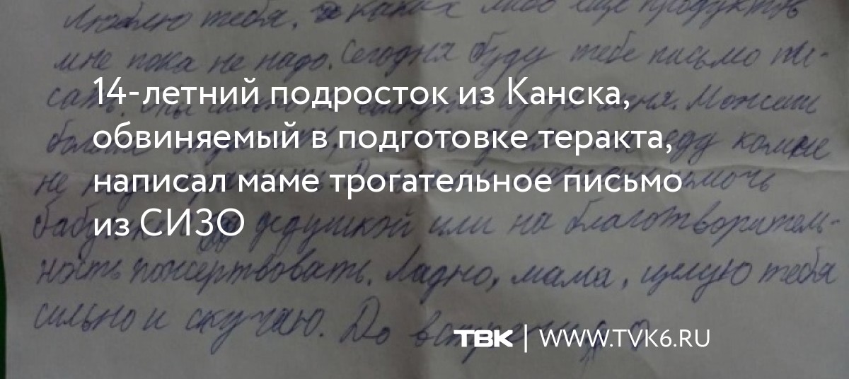 14-летний подросток из Канска, обвиняемый в подготовке теракта, написал маме трогательное письмо из СИЗО