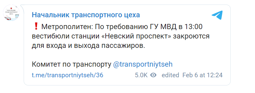 Пресс-секретарь губернатора Инна Карпушина сообщила «Бумаге», что вопрос о перекрытиях нужно задавать в ГУ МВД по Петербургу. В ведомстве рассказали, что это не так, и направили в комитет по транспорту. При этом ранее комтранс в официальном телеграм-канале опубликовал новость о закрытии метро по требованию МВД.