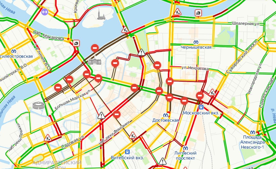 В 13:00 станции «Невский проспект» и «Гостиный двор» закрыли на вход и выход. Примерно в это же время остановили движение транспорта по Невскому и прилегающим улицам. Автобусы, троллейбусы и трамваи шли по укороченному маршруту. Карта перекрытий выглядела примерно так.