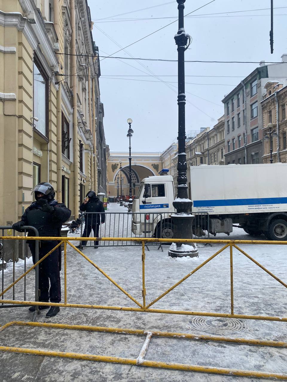 Вечером в пятницу на Невском проспекте и Дворцовой площади установили ограждения. В субботу утром заборов стало еще больше — они появились на Гороховой, набережных Фонтанки и Мойки. В центр города также стягивали силовиков.