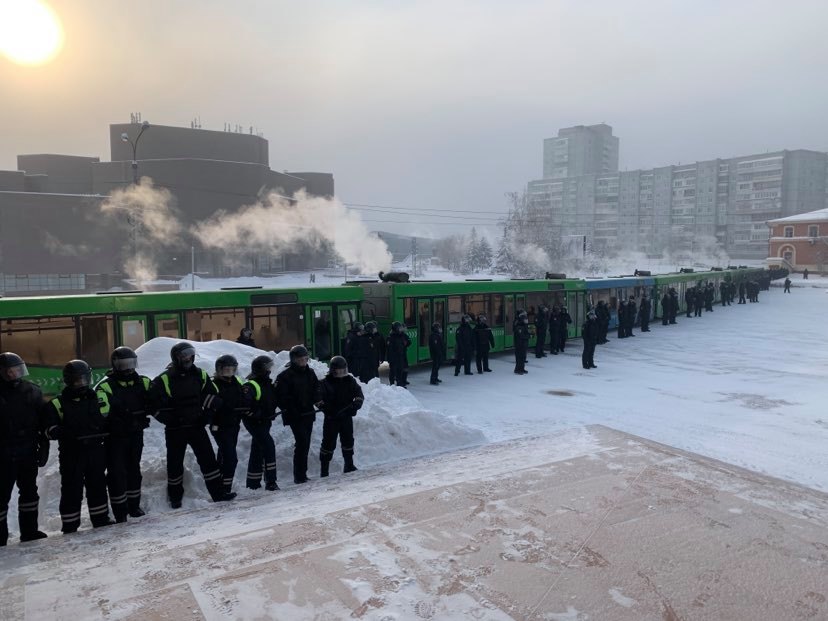 – В Красноярске 31 января было 33–35 градусов мороза, очень холодно. Все, кто собирался идти, одевались тепло. Переживали, что будет очень мало народу. Собралось несколько сотен человек – до 500 примерно. От 23 января отличалось тем, что сразу было видно – везде огромное количество ОМОНа, по разным переулкам стоят автобусы, шеренги. На все три площади, куда собирались люди, на главной городской – Красной площади, на площади Революции и площади Мира, накануне привезли и высыпали в разном виде и разных формах десятки тонн снега.