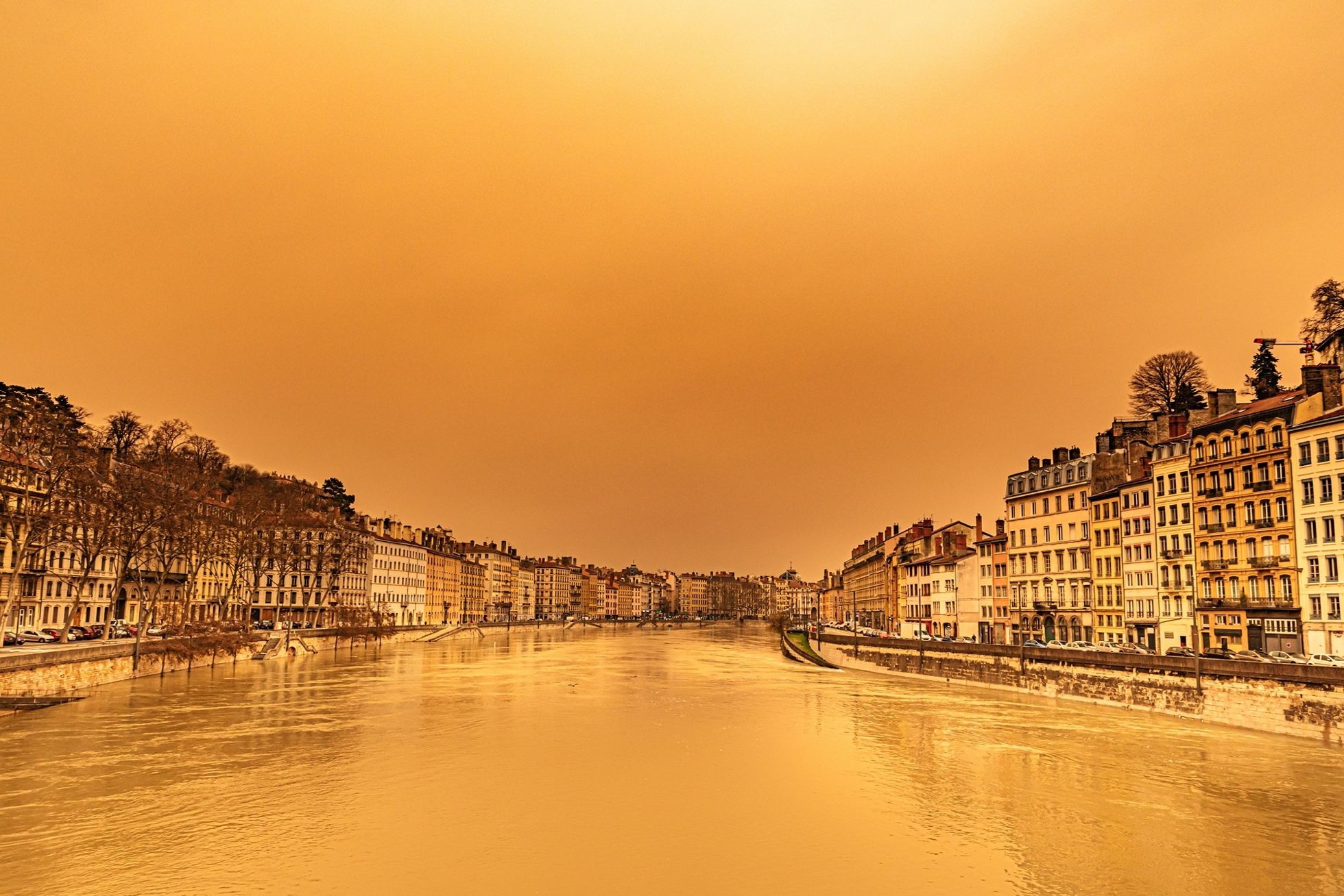 Konrad K. / Sipa / Scanpix / LETA 6 февраля жители Франции, Швейцарии, Андорры и других европейских стран наблюдали редкое метеорологическое явление — в городах небо окрасилось желтым цветом, а снег на горнолыжных курортах получил коричневый оттенок. Это произошло из-за жаркого ветра сирокко, который принес с собой большое количество мелкого песка и пыли из пустыни Сахара. На фотографии: вид на набережную реки Сона во французском Лионе.